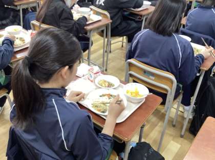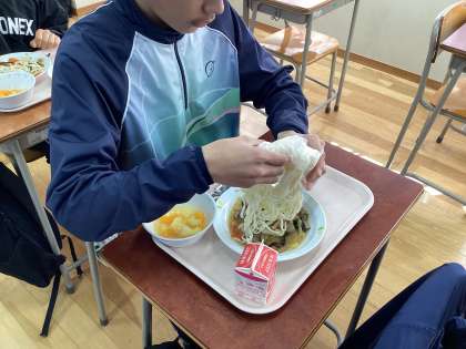 今日は昭和40年代の給食です。給食のメニューにバリエーションを増やすため、パンと同じ小麦(強力粉)を使ったソフト麺が昭和35年に学校給食用として開発されました。昭和40年に東京都がソフト麺を採用してから、各地に広がっていきました。正式名称は「ソフトスパゲッティ式めん」といいます。