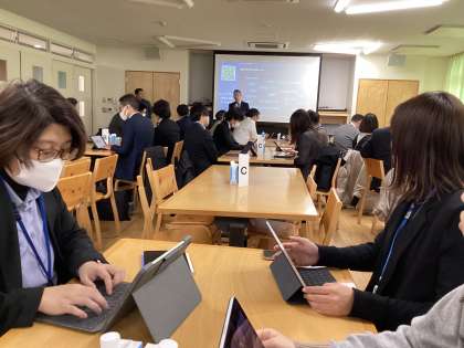 本校はICT機器を活用した探究的な学びの実践研究に取り組んでいます。過日Apple Distinguished Schoolに認定され,日常の教育活動における取り組みの様子を紹介する機会として,5校時に1・2年生の授業が公開されました。他県教育関係者や異業種を含め,100名に及ぶ来校者が参観し,放課後に研究協議会が開かれました。