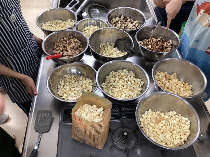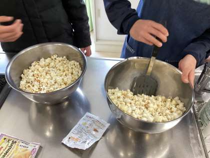 放課後に調理室の方からいい匂いがすると思い立ち寄ってみると、技家部と科学部がポップコーンを作って、様々な味付けをしていました。