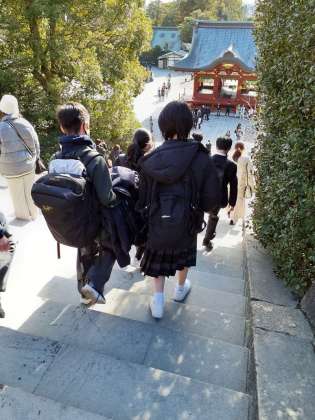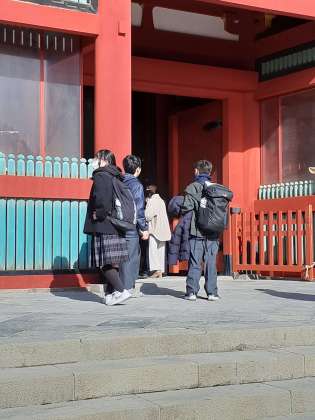 鶴岡八幡宮で、最後の班がじっくりお守りなどを選んでいます。