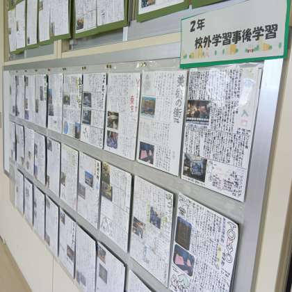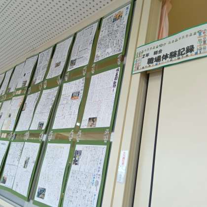 2年生では、職場体験レポート、校外学習レポートが教室外の壁面に掲示されていました。