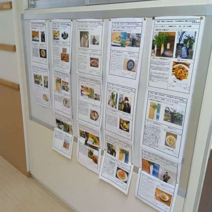 金工室には、技術の授業で製作した木工作品、廊下には生物育成のレポートが展示されています。家庭科とコラボで?美味しいレシピも写真入リで紹介されていました。