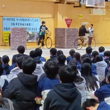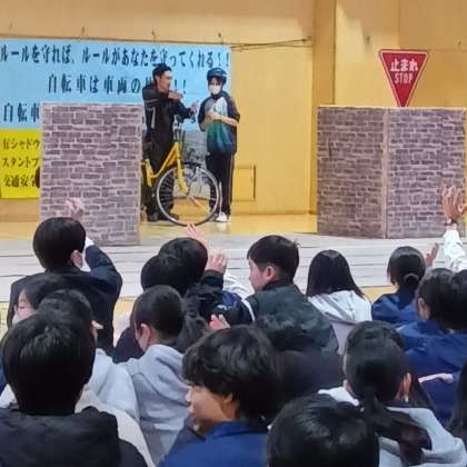 標識の確認、事故に繋がる危ない乗り方を実演してくれ、安全な自転車の乗り方を学びます。