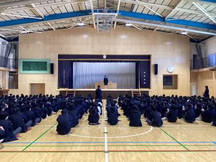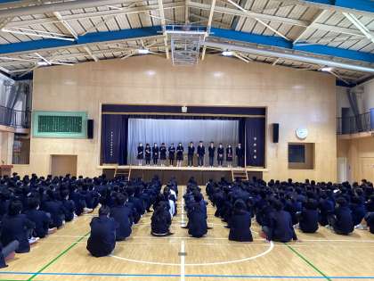 3月18日(月)今年度最後の生徒会朝会が行われました。各委員長が登壇して、後期を振り返り発表しました。また、図書委員からは、多読賞の発表があり各学年から3人が受賞しました。