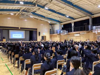 今日は1時間目に生徒会主催の新入生歓迎会がありました。部活動や委員会紹介の動画はとても魅力的に作られていて、先生たちも上級生の動画作成力の高さに驚かされました。先生紹介&質問コーナーでは1年生からたくさんの質問が出て、会場が盛り上がりました。新年度がスタートして初めて全学年が顔を合わせましたが、とても和気あいあいとした良い時間となりました。