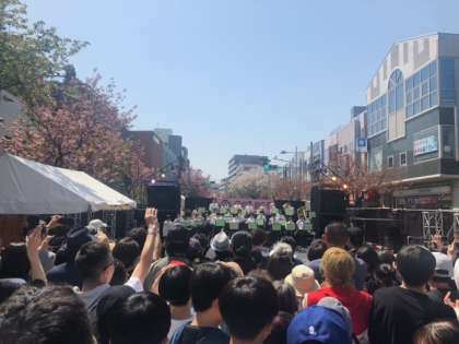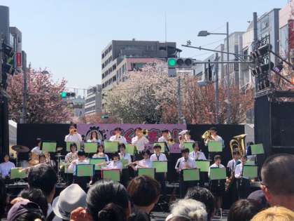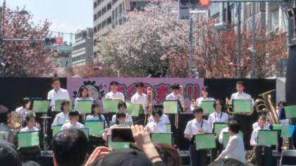 桜まつりに参加した吹奏楽部、「東京ブギウギ」の軽快な音楽から演奏はスタートです。観客は「押すな、押すな」の大賑わいです!