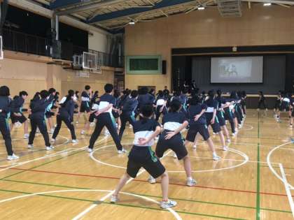 3年生が体育祭に向けてソーラン節の練習をしています。まずはお手本画面を見ながら動きの確認をします。
