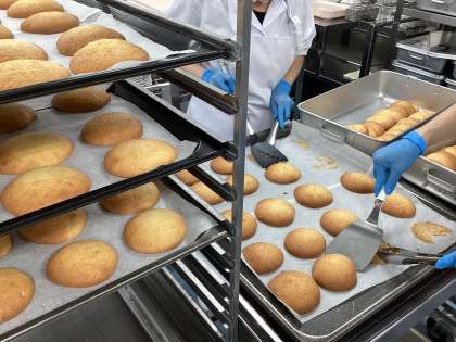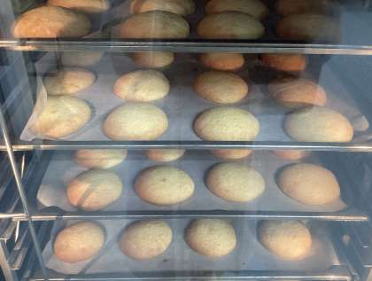 生地を天板に落として焼くと、自然に広がって円盤型になります。