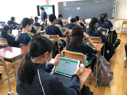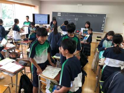 1年生の英語の授業では『can』を使った内容を学習していました。授業始めに『country road』を元気よく歌って気持ちをほぐした後は、英語ビンゴやiPadを活用した英文のリーディング、ペア学習と続きます。1年生は、どの学習にも積極的に取り組んでいました。