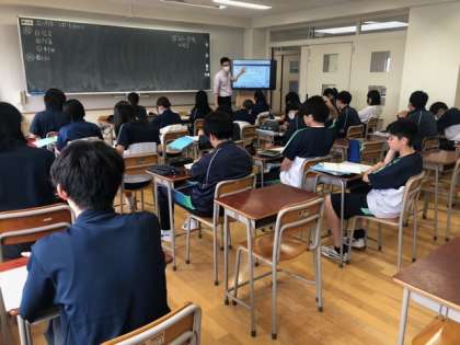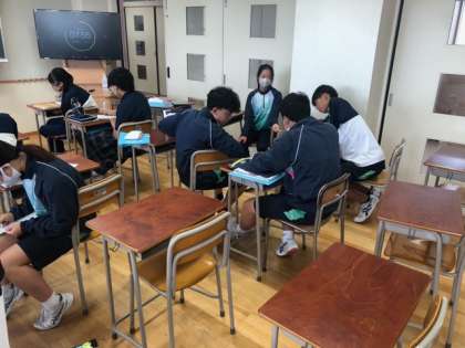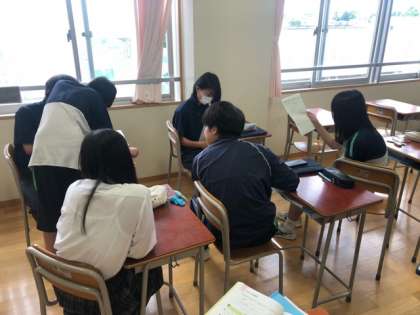 2年生数学の授業では「式の計算」の単元で、数の並びから性質を見つける学習を行っていました。自分の考えのみならず、友だちが立てた予想について「なぜそう考えたのか」を考えることで、考え方の幅を広げます。グループ学習では自分の考えを積極的に仲間に伝えていました。