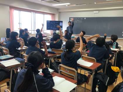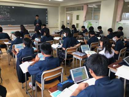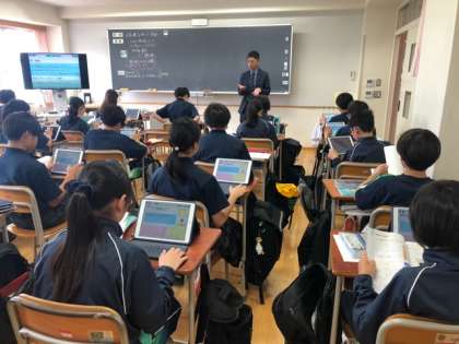 1年生数学の授業では「正負の数」の単元の振り返りをしていました。ロイロノートに単元を学んで『わかったこと』や『もっと知りたいこと』などをまとめていきます。後半は自分のペースでキュビナの問題を解いていきました。みんな集中して取り組んでいました。