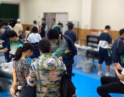 写真は科学部の生徒が地域の子どもたちに『スライムづくり』を教えている様子です。