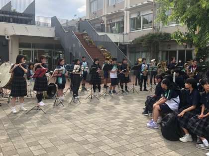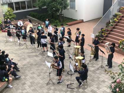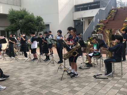 吹奏楽部が中庭でミニコンサートを行っています。1年生デビューです!軽快な音楽に思わず手拍子が飛び出します。