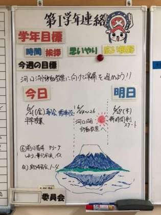 ?1年生は、24日(月)より河口湖移動教室へ出発します。6校時の学年集会では最終確認を、職員室前の1学年ホワイトボードには見事な富士山が描かれ、職員室には色とりどりのてるてる坊主が!準備は万端です。一人一人の心に残る宿泊行事となりますように。主役は生徒の皆さんです!