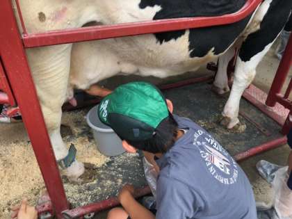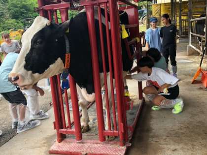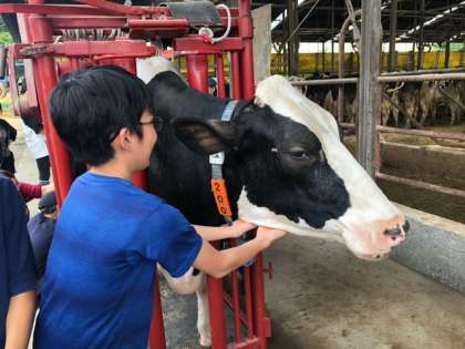 牛の乳搾り体験です。最初は牛の大きさにびっくり!でしたが、みんな牛を優しく撫でながら乳搾りにチャレンジします。