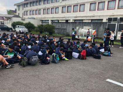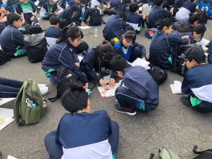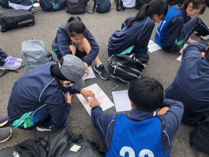 オリエンテーリングの説明を受けています。コンパスの使い方、難しいなあ。