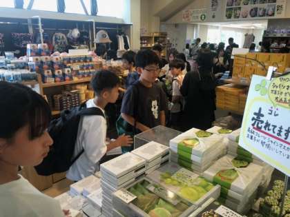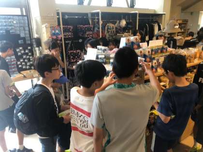 河口湖自然生活館に着きました。目の前に富士山、河口湖が広がり、素晴らしい景色です。生徒たちはあれこれお土産を選んでいます。何にしようかなあ。