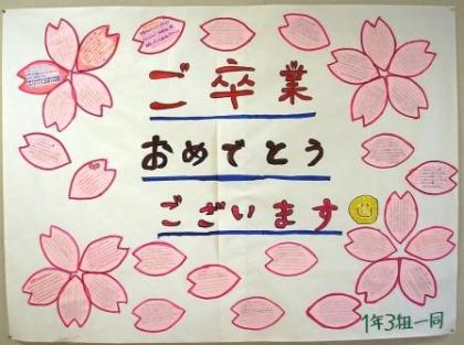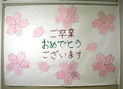 1年生から3年生へお祝いのメッセージの桜が廊下で満開になりました。
