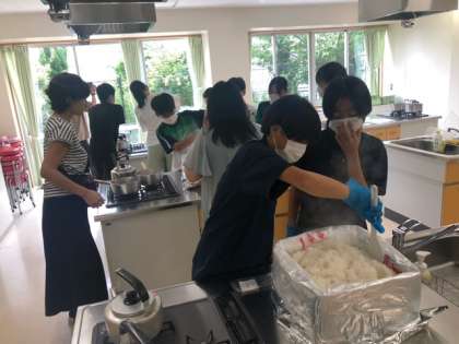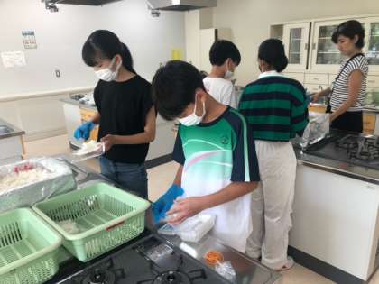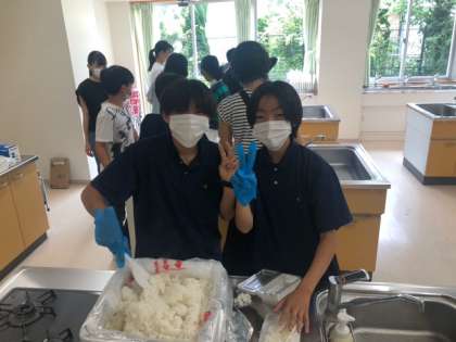 出来上がったアルファ米を、各クラスの学級委員が手早く弁当容器に盛り付けていきます。まるでお弁当屋さんになったみたい!?あとはいよいよ教室で実食です!
