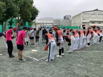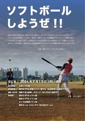 今日は深沢中学校の校庭で、PTAのメンバーを中心としたソフトボール大会が行われました。参加校は深中チーム(パパ、ママ、生徒、先生混合)深沢小PTAソフトボール部、桜町小PTAソフトボール部、さくら幼稚園ソフトボール部の4校です。深沢中の校長先生・副校長先生の始球式から始まり、深中チームは第1試合に深沢小チームと対戦しました。惜しくも負けてしまいましたが、和気藹々とした楽しい試合となりました。この大会は親睦を目的としており、深中PTA所属のメンバーであれば未経験者でも楽しめるものとなっています。次に機会がありましたら、参加してみてはいかがでしょうか。