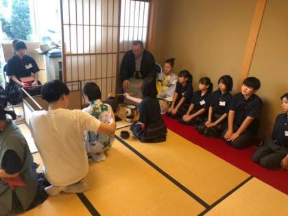 茶道部が、特別夏季集中講座を行なっています。今日がその三日目、みんな集中して指導してくださる方々のお話を聞きながら茶道の所作を学んでいます。