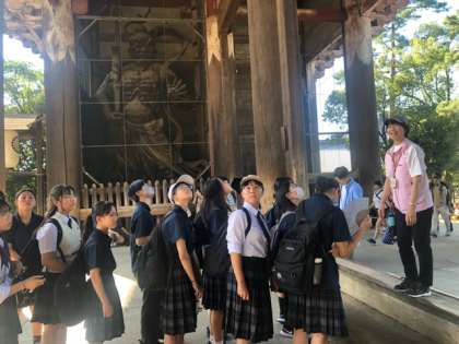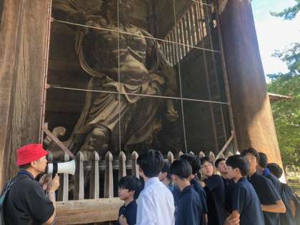 奈良公園内は、各クラス男女ごとにガイドさんがついて案内してくれます。写真は南大門の金剛力士像について説明していただいているところです。