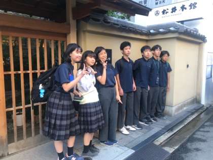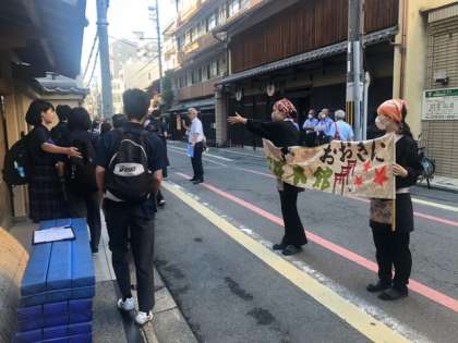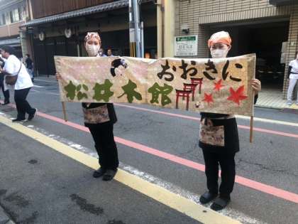 宿の皆さまが、横断幕を掲げてお見送りしてくださっています。