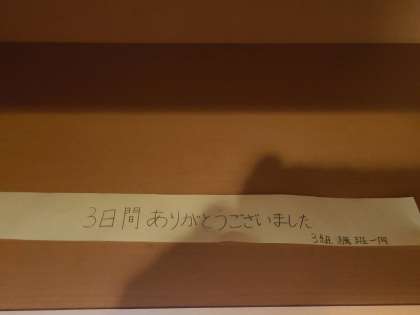 生徒の部屋の最終チェックをしていたら、ちょっとほっこりすることがありました。下駄箱に「3日間ありがとうございました」という置き紙が。こんな心配り、素敵ですね!