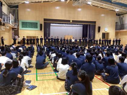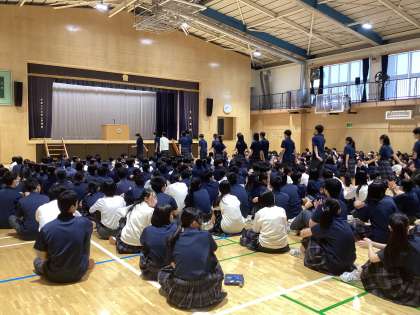 今朝は生徒朝会が行われて、各委員長さんから前期のまとめがありました。