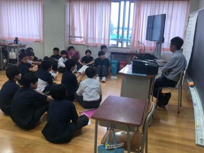 4組も男女に分かれてパート練習です。練習始めに担任の先生を囲み車座になって、さて、何の作戦会議かな?