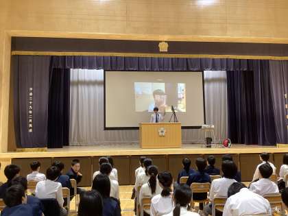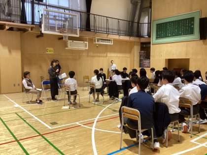 本日の6時間目、2年生はビブリオバトルの決勝戦がありました。各グループから選ばれた9名がおすすめの本を紹介します。今回の質疑応答は、図書館司書さんにお願いしました。本や発表者の考えについての鋭く深い質問に対して、どの発表者も自身の思いを丁寧に答えていました。ビブリオバトルは昨年度に続き、 2回目の取り組みでした。今年度は、より発表が上手になっていると、司書さんからお褒めの言葉がありました。決勝戦後には「来年こそは決勝に進むぞ!」と意欲的な生徒の姿がありました。来年度も熱の入った決勝戦を期待しています。