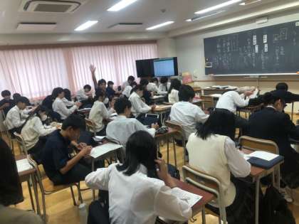 2年生の国語の授業は文法を学習していました。「文法はちょっと苦手」という生徒も多いのでは!?そこで、先生はワークやQubena、ロイロノートの問題などを活用しながら、少しでも楽しく学習できるよう工夫しながら進めていました。