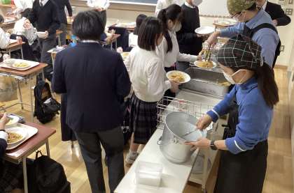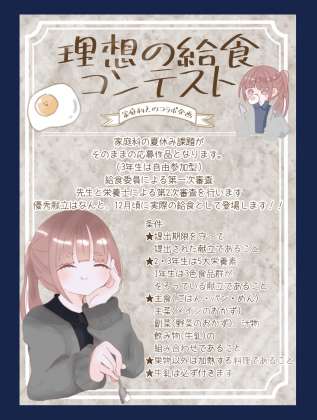 1・2年生家庭科の夏休み課題(3年生は自由参加)だった「理想の給食コンテスト」の献立が実際の給食に登場しました。夏休み前に掲示した校内告知ポスターは、給食委員の生徒の作品です。