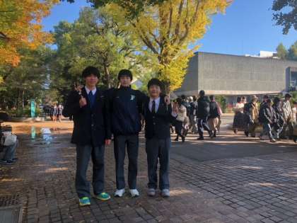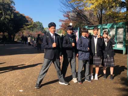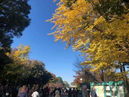 上野公園です。青空と色付いた銀杏が美しいです!生徒たちは元気いっぱいです。