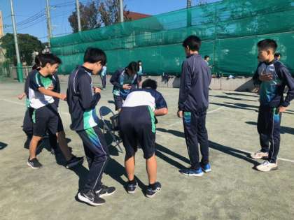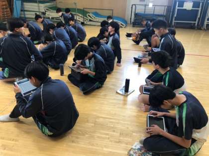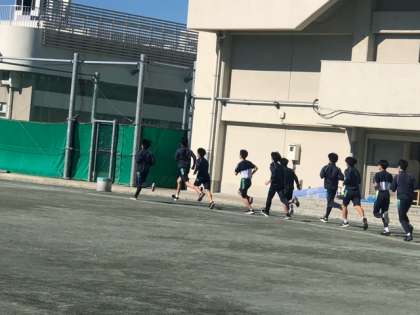 3年生が保健体育の授業で持久走遠行っています。まずは前回の記録を確認、今日の目標タイムを設定します。1,500mを走る前に校庭を一周し、心拍数を確認します。