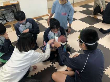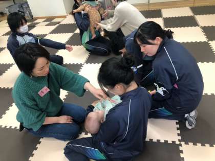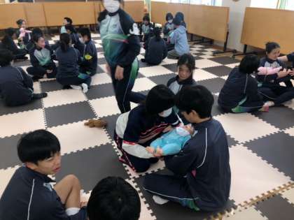 今日も2クラスで赤ちゃんふれあい体験を行なっています。赤ちゃん人形で抱っこの練習をして、いざ、本番に挑みます!?