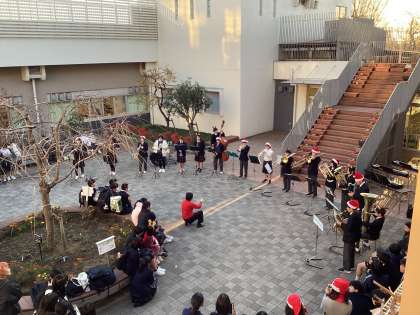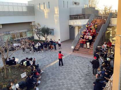 12月17日の放課後に、中庭でPTAコーラスの方々と吹奏楽部によるミニコンサートがありました。