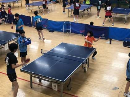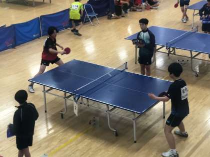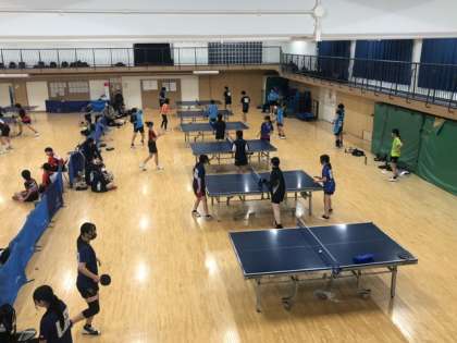 ?卓球部が、複数校招いて練習試合をしています。たくさんの卓球台を使って、多くの生徒たちが気合い十分で試合に臨んでいます。実践を積むのにはもってこい!ですね!