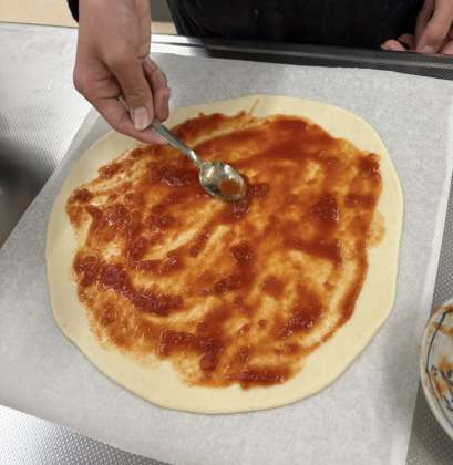 トッピングも自分たちで切り、生地に飾り付けて焼き上げました。