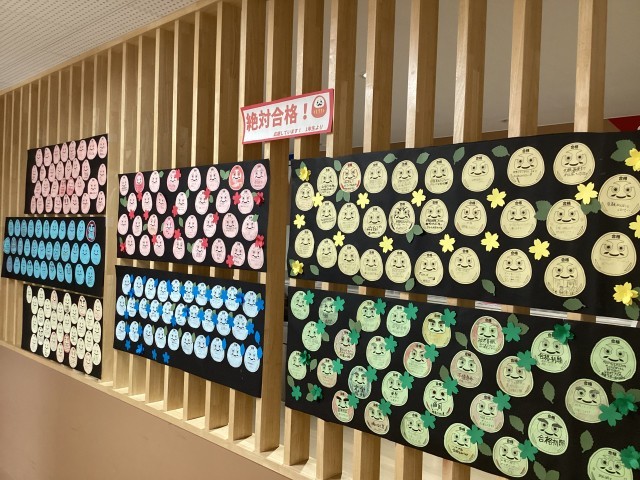 本日、1年生と 2年生は定期考査④(学年末考査)の最終日です。休み時間は次の試験科目の勉強を熱心にしています。友達同士でプリントを確認したり、問題を出し合ったりしている姿がありました。3年生は都立入試の日です。ダルマの写真は1、 2年生からの合格祈願メッセージです。後輩の応援を背に、3年生は実力を発揮できますように!