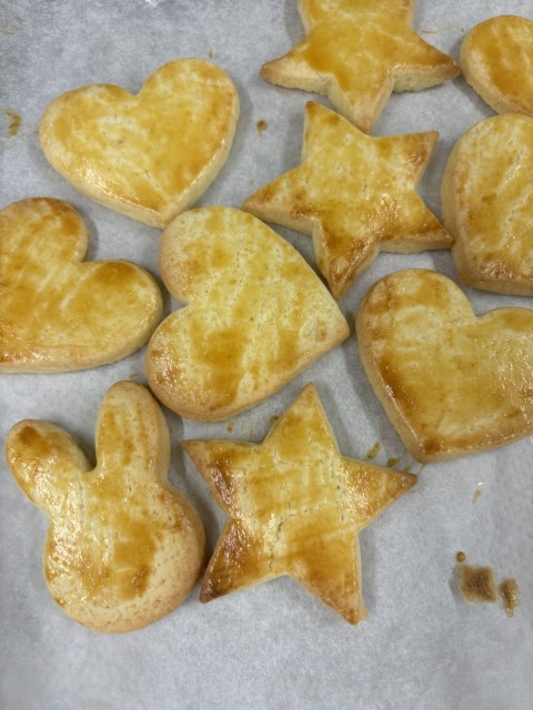 小麦粉、バター、砂糖、卵などをしっかり混ぜて生地を作り、伸ばしたものをクッキー型で型抜きして焼き上げました。