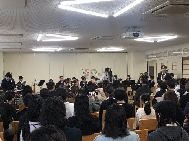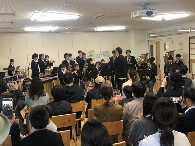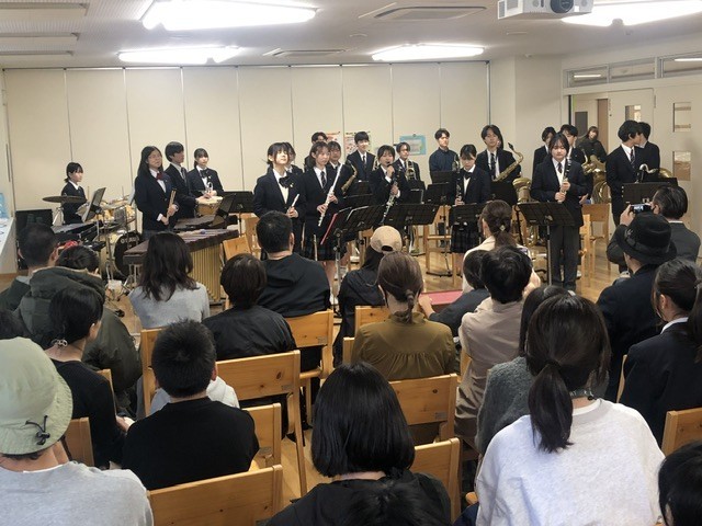 吹奏楽部も桜まつりのステージに出演予定でしたが、雨のため、深中ランチルームでミニコンサートを行いました。リズミカルな音が、ランチルームいっぱいに広がります!