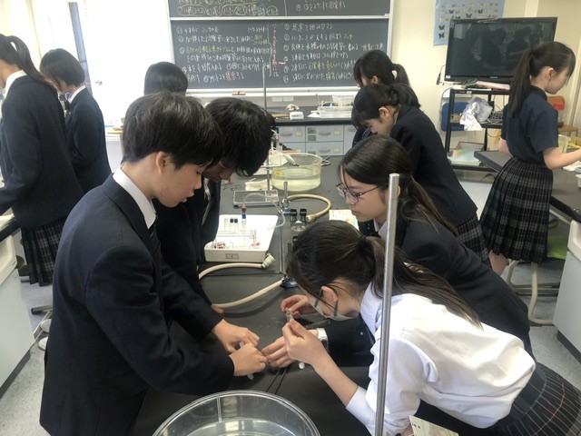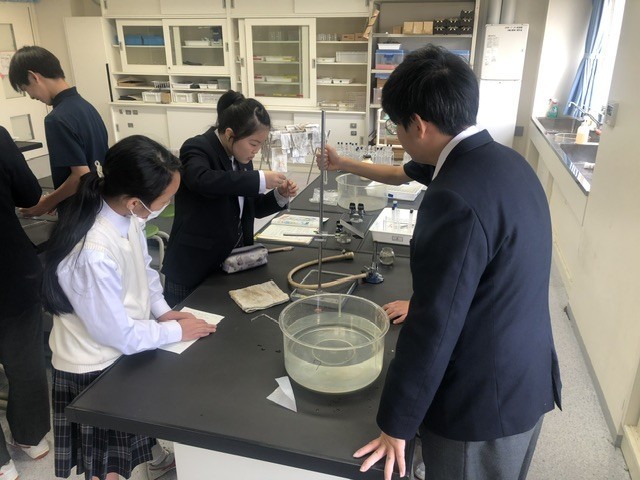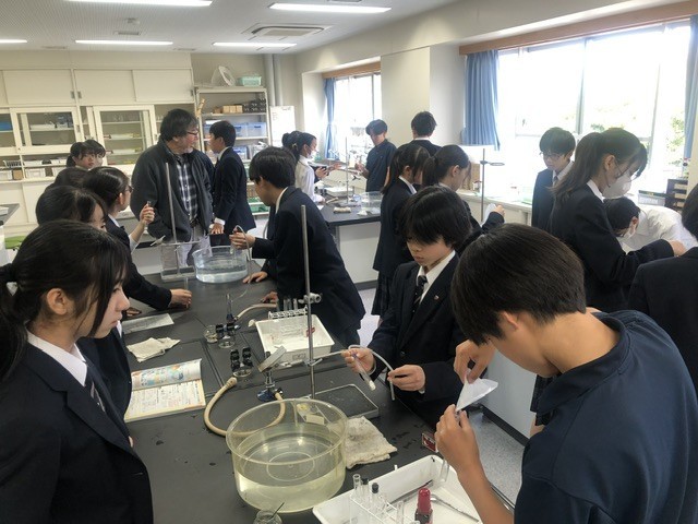 2年生が「炭酸水素ナトリウムを加熱した時の変化」についての実験をしています。みんな真剣に取り組んでいます。