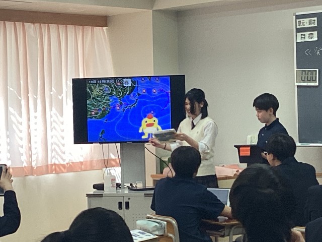 今日は天気図をもとにした、天気予報を班ごとに発表しています。
