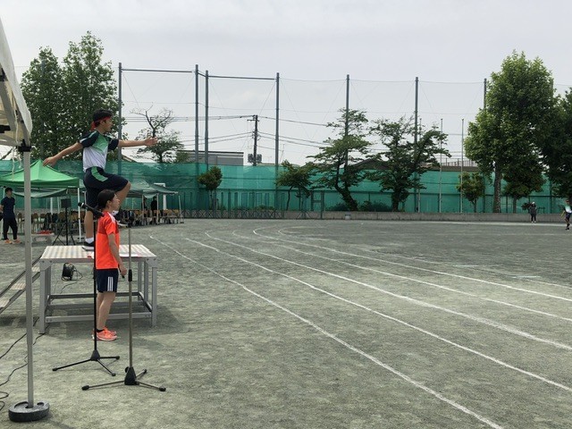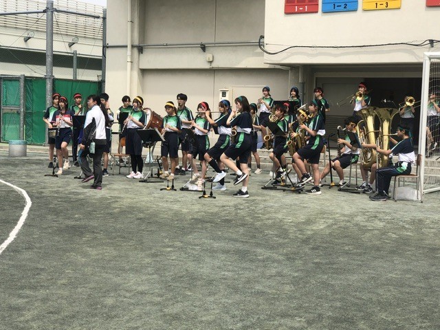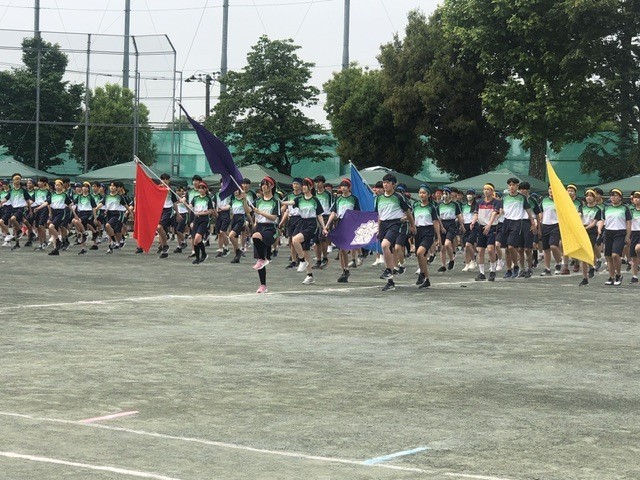 今日は体育祭予行です。実行委員の笛の合図で全体が動き始めます。吹奏楽部の軽快な音楽にのせて、元気のよい入場行進です!