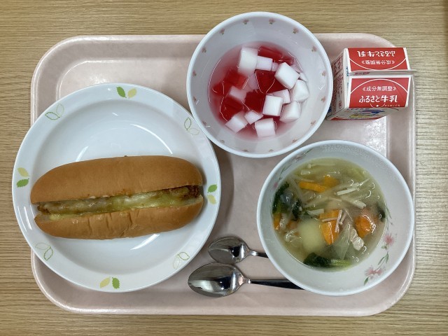 今日の献立・・・カレービーンズドッグ、野菜スープ、紅白ゼリー、牛乳