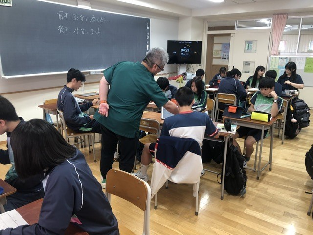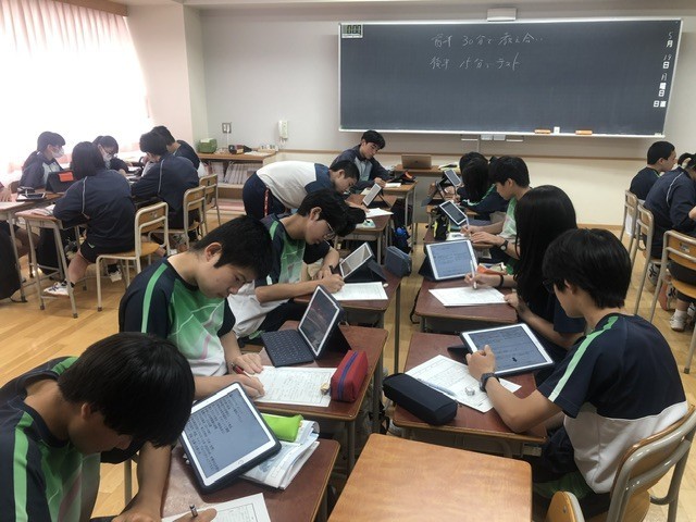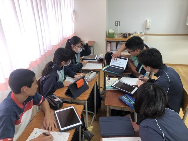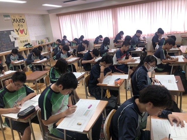 3年技術の時間では「エネルギー」について学習していました。まずは水力発電や火力発電など様々なエネルギーについて調べたことを班で共有、教え合いをします。最後に、調べたエネルギーに関するテストをしました。生徒たちは、学び得たことを問題用紙に必死に書き込んでいました。