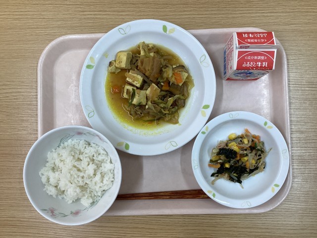 今日の献立・・・ご飯、カレー肉豆腐、ツナとわかめのサラダ、牛乳