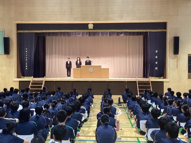 3週間にわたる教育実習も最終日を迎え、朝礼で挨拶がありました。3人の実習生の素直で若さ溢れる姿勢は、生徒はもちろん、教職員にも爽やかな風をもたらしてくれました。実習期間には体育祭もあり、実習生の皆さんは大活躍でした。大学に戻ってからも頑張ってください。