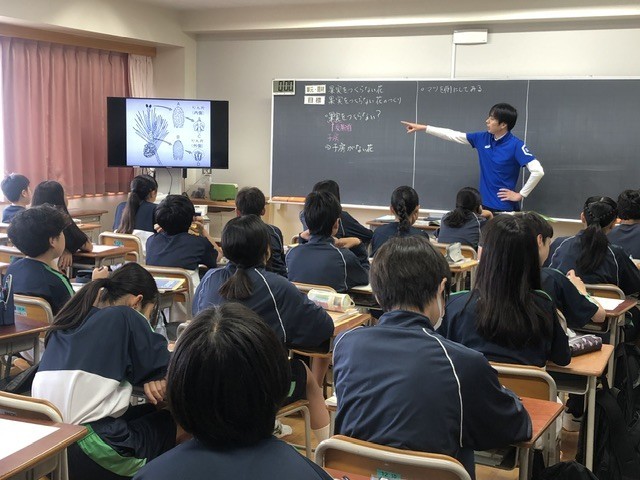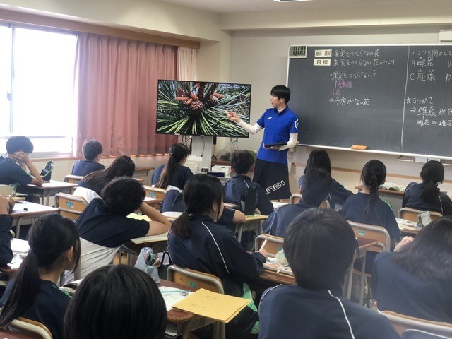 1年理科の授業は「果実をつくらない花のつくり」について学習していました。生徒たちは映し出された画像を真剣に観ていました。